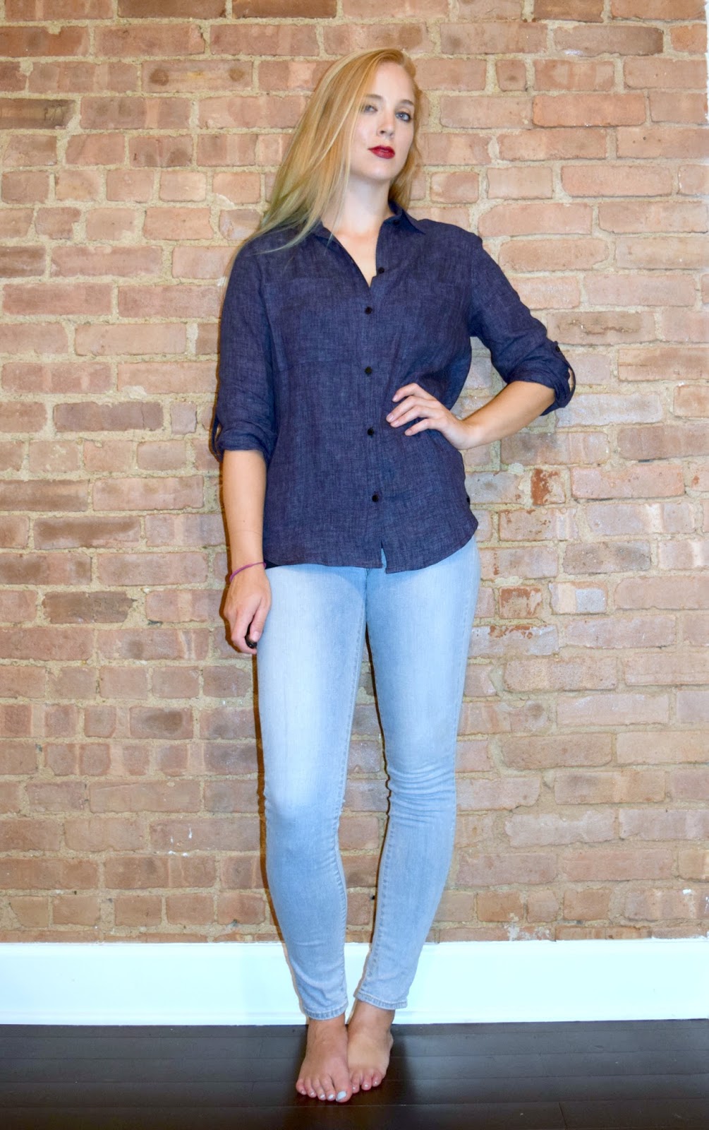 I ended up getting this really pretty blue linen a while ago and I intended to make a dress out of it, but I was worried it would be a bit sheer in sunlight and also I wasn't sure how I would feel about the wrinkly linen look on my entire body. I think for just a shirt it makes sense but I thought I might feel rumpled if it were my entire look for the day. After I decided against a dress I couldn't resist making it into an archer!